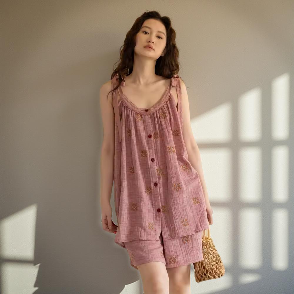 A lightweight, pure-cotton gauze shorts set featuring delicate embroidery and a relaxed halter-tie top. Soft, breathable and effortlessly feminine perfect for warm summer days and cosy home lounging.