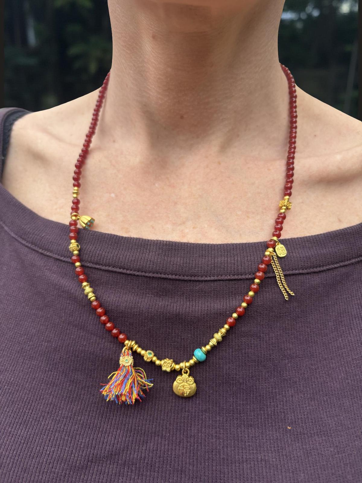 A radiant strand of polished red agate beads, paired with soft gold accents and a mix of symbolic charms. At the centre sits a petite gold “money bag” pendant, believed in many cultures to represent good fortune and abundance. Finished with tiny beads of turquoise and a colourful tassel for a playful touch, this necklace brings a little sparkle, a little meaning, and a lot of personality to your everyday style.